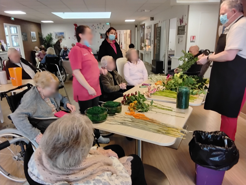 Ce matin : - sortie à CarrémentFleurs pour l’achat de fleurs 🌸 afin de préparer des compositions. - diverses questions : placer un sport, une fleur, un légume... sur la bonne saison . Cette après-midi, atelier floral, plusieurs compositions ont été préparées avec l’aide du fils d’un résident et place à la collation, un grand gâteau servi pour les anniversaires 🎂 🎂 du mois.