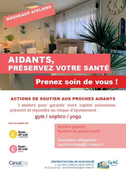 En parallèle, nous vous informons que le Centre d'Accueil de Jour de l'Hôpital de Dreux met également en place des actions auprès des aidants. Trois ateliers sont proposés : gymnastique, sophrologie et yoga. Ces ateliers sur inscription sont gratuits et ouverts à tous. Vous trouverez les informations nécessaires dans le flyer ci-joint.