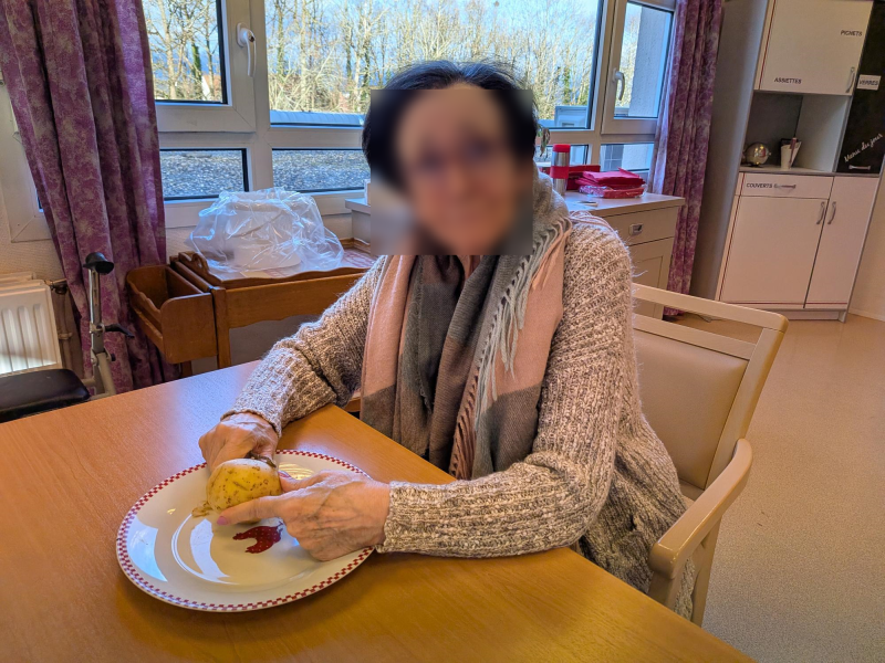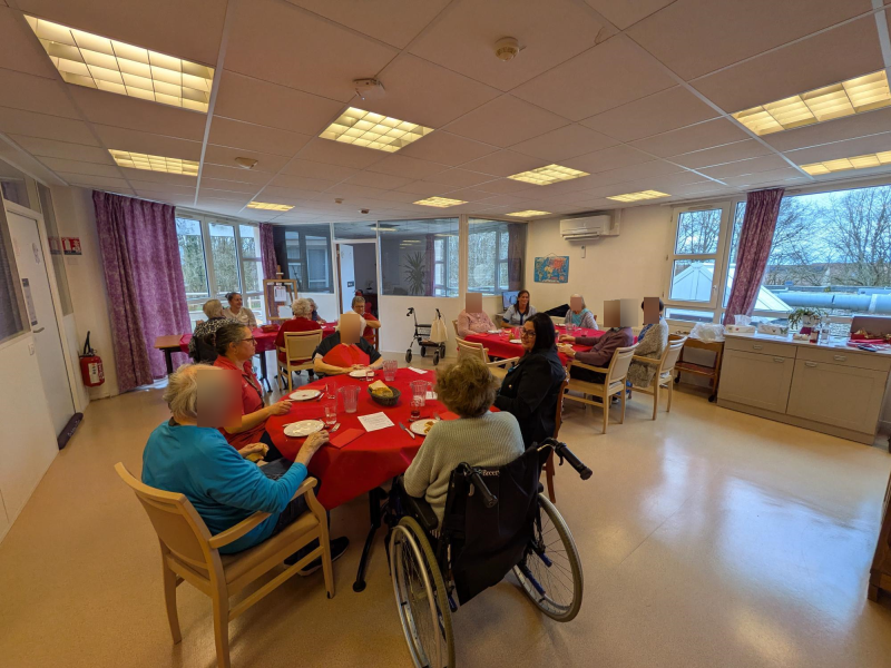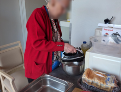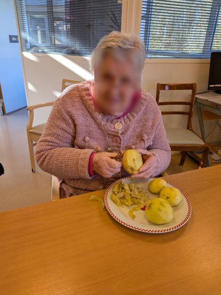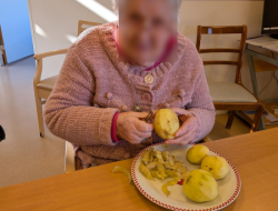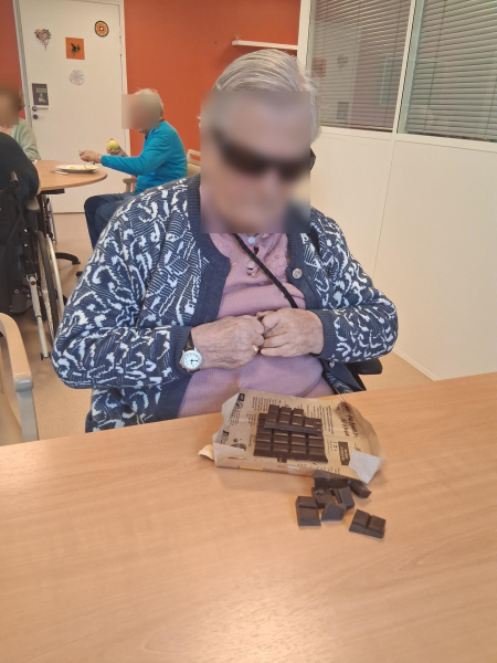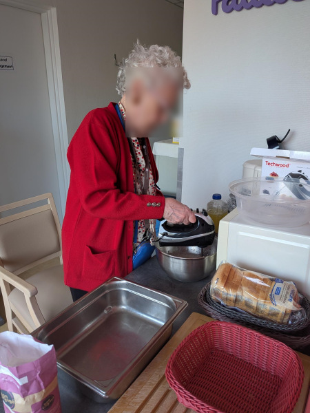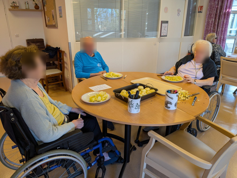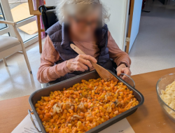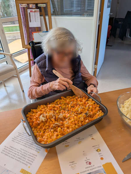 Ce matin les résidents du PASA, encadrés par Christel, ASG, Justine, ergothérapeute, et Audrey, psychomotricienne, ont cuisiné un repas de saison. Au menu, mini crumble de potiron au fromage, boudin aux pommes et purée maison, et pour finir une mousse au chocolat ! Chacun a pu participer aux différentes étapes de la préparation en fonction de ses capacités. Après avoir dressé les tables, nous avons mangé tous ensemble et nous nous sommes régalés!